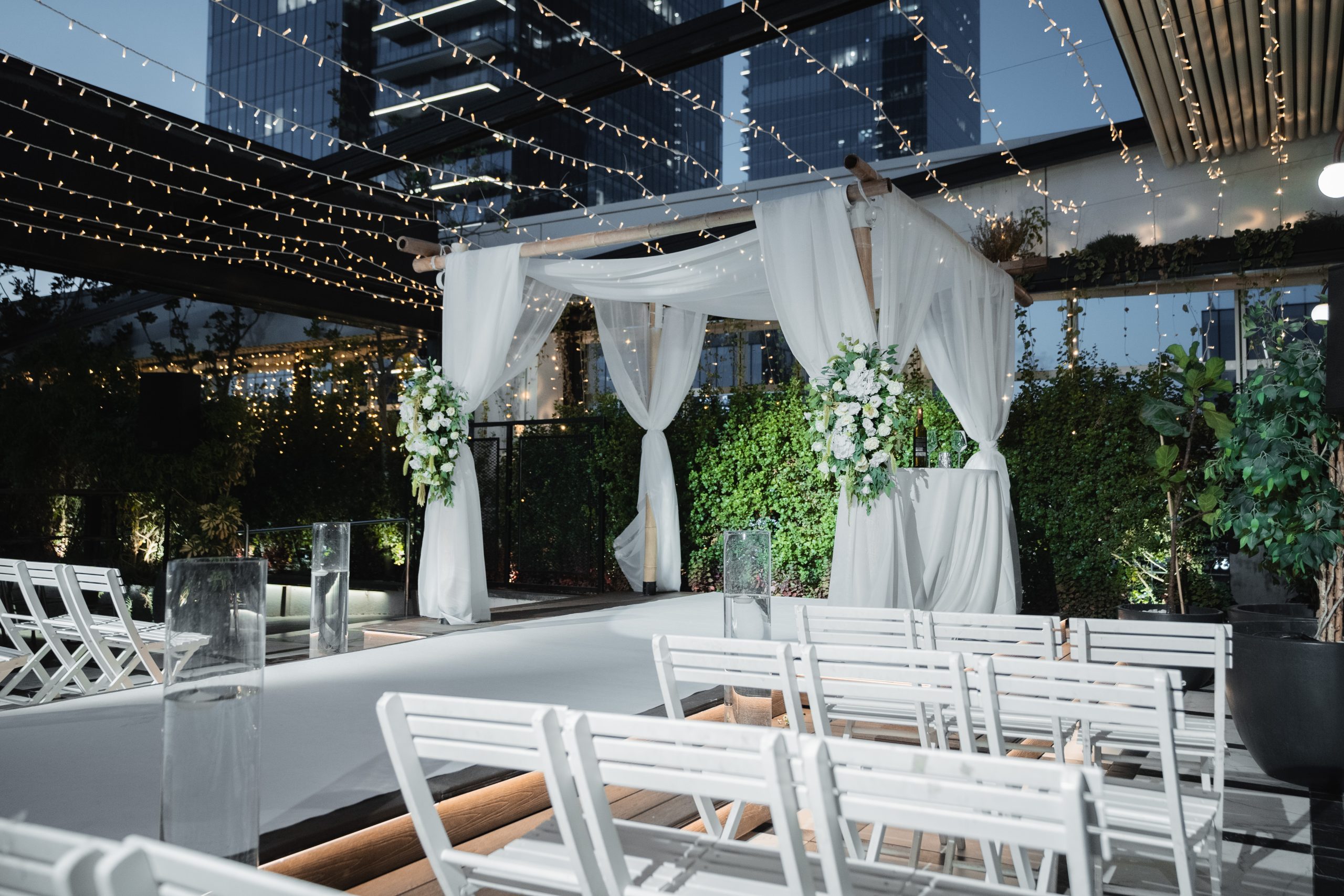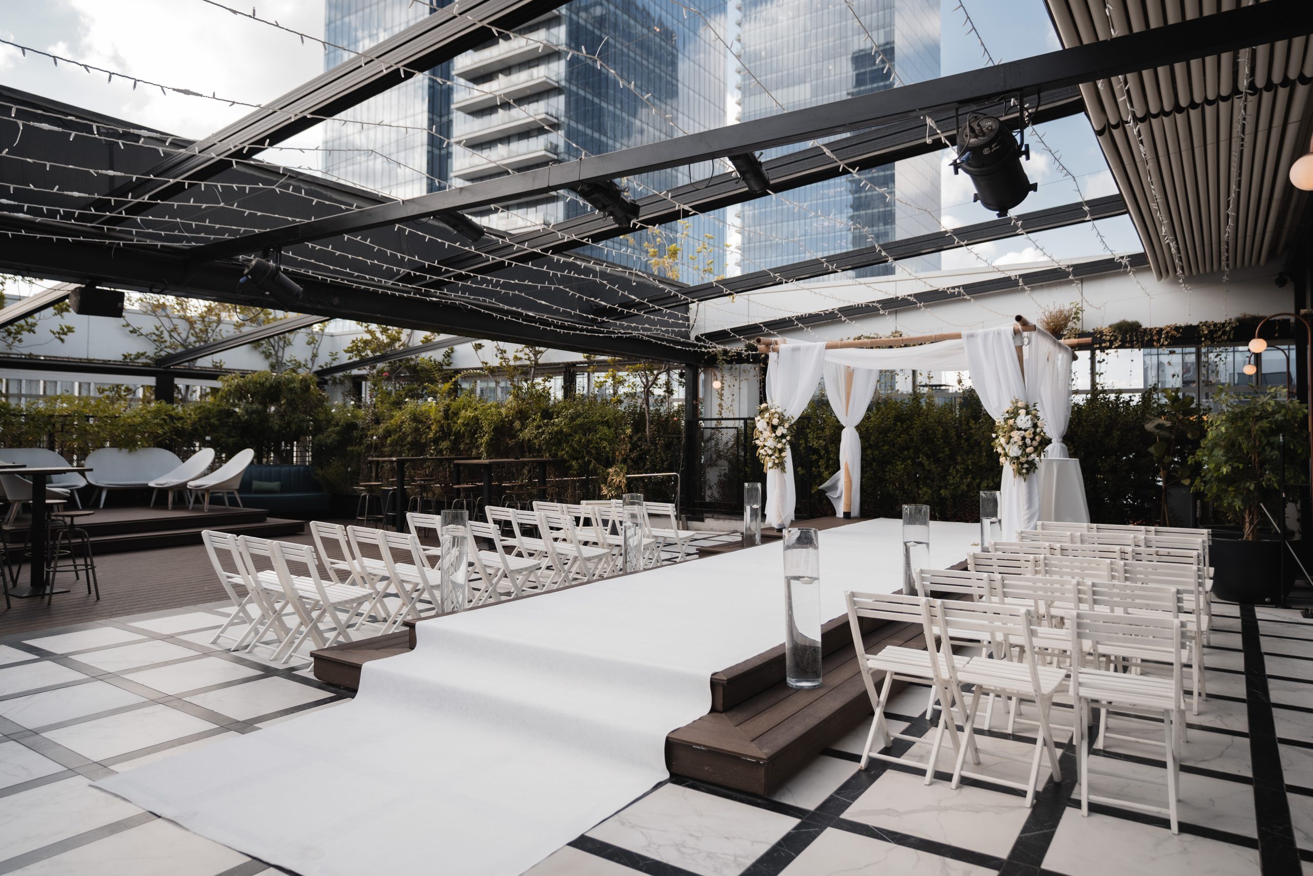 שני המפלסים מעוטרים בתאורה מהאגדות, נורות fairy על גרילנדות היוצרות וייב חגיגי כמו גם אווירה רומנטית ועדינה בשלב ההתחלתי של הערב, פתרון מושלם למי שרצו אותנטיות טבעית כמו של גן אירועים אורבני.